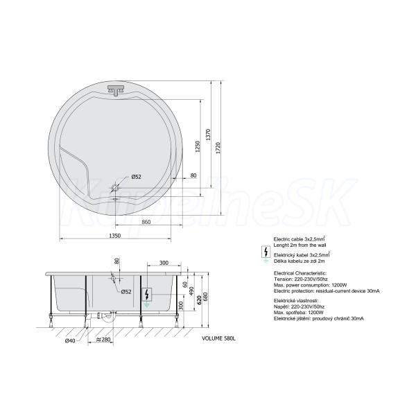 Polysan ROYAL ROUND hydromasážna vaňa, 172x172x49cm, Attraction Hydro, Biela,krytka Chróm