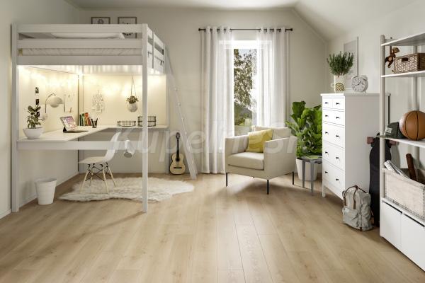 Dub Pinot pieskový reprodukuje vzhľad skutočnej drevenej podlahy a dodáva interiéru prírodný charakter. Jednoduchý vzhľad v kombinácii so svetlohnedou farbou vytvára v interiéri moderný, nadčasový a autentický dojem. Podlahové dosky vo formáte Classic zvýraznia celkový dojem z priestoru. 4- stranné priznané drážky po celom obvode zvýrazňujú vzhľad jednotlivých podlahových dosiek.