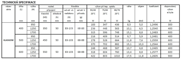 Dostupné rozmery a typy pripojenia radiátora GLASGOW :