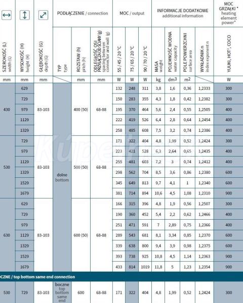 - 530 × 979 mm, výkon 434 W, (vykurovacia tyč 400 W)