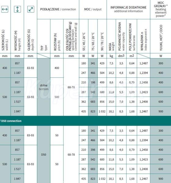 - 530 × 1187 mm, výkon 542 W, (vykurovacia tyč 600 W)
