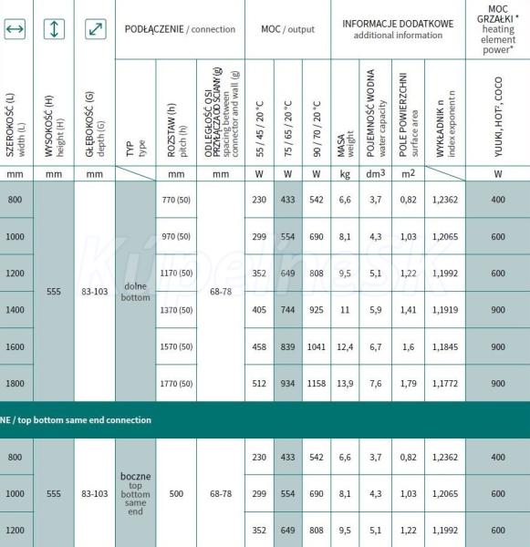 - 1000 × 555 mm, výkon 554 W, vykurovacia tyč 600 W - pripojenie klasické (na rozstup) / stredové 50 mm