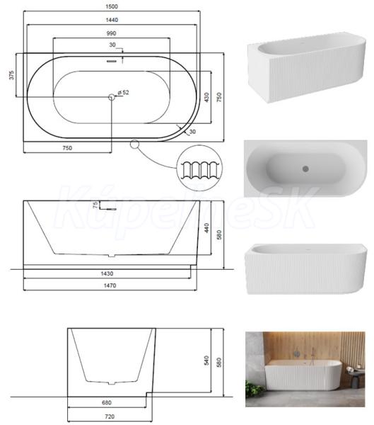 - 150 x 75 x 58 cm, objem 220 l, hmotnosť prázdnej vane 43 kg