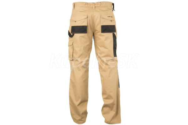 béžové pracovné nohavice 100% bavlna, 270 g/m2 9 vreciek vrátane 6 so zapínaním na suchý zips vrecko na mobilný telefón trojité švy nastavenie šírky v páse pomocou gombíkov krúžok na kľúče, slučka na kladivo vrecká a vrecká na kolenách