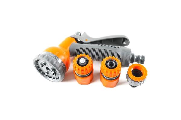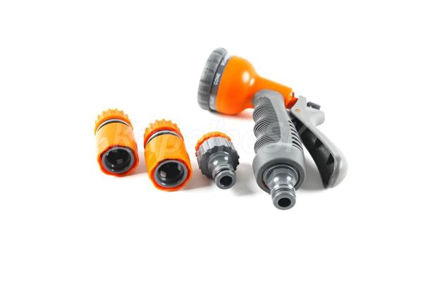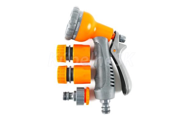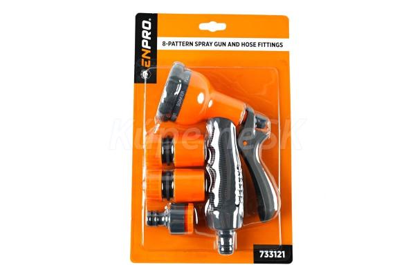 sada s 8 funkčnými pištoľami, ENPRO Sada obsahuje: 8 funkcií, rýchlospojku 1/2, rýchlospojku 1/2" + uzatvárací ventil, adaptér s vnútorným závitom 3/4 kvalitná 8-funkčná pištoľ vyrobené z vysokokvalitného plastu univerzálny adaptér - pre