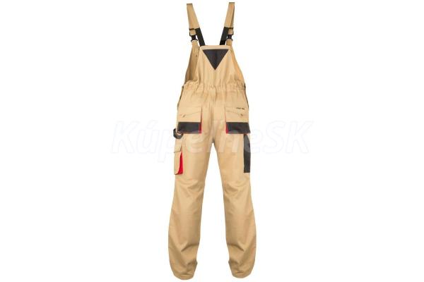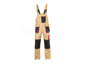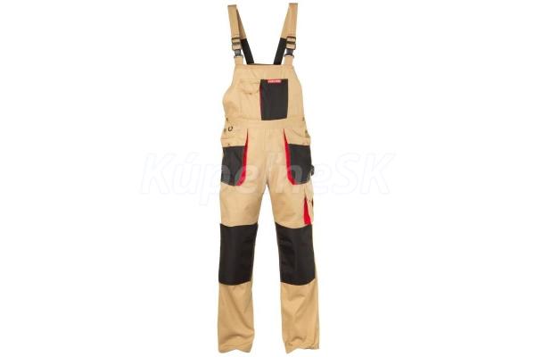 kombinéza, béžová s lakom 100% bavlna, 270 g/m2 špeciálna konštrukcia klipu, ktorá zabraňuje jeho skĺznutiu 10 vreciek vrátane 6 so suchým zipsom vrecko na mobilný telefón trojité švy nastavenie šírky v páse pomocou gombíka
