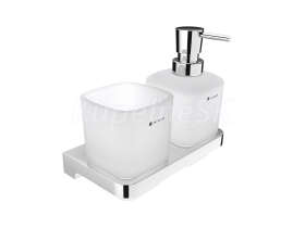 Dvojitý nástěnný držák na dávkovač mýdla a pohárek na zubní kartáčky z matného skla. Nádobky z matného skla v kombinaci s chromovaným držákem perfektně ladí prostoru u umyvadla. Díky montáži na zeď je údržba umyvadla mnohem jednodušší. Dávkovač mýdla s plastovou pumpičkou, povrchová úprava chrom. Pro vyladěnou koupelnu doporučujeme i další produkty této designové řady.