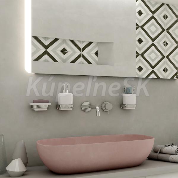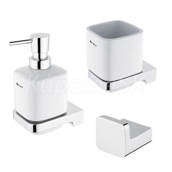 Sada koupelnových doplňků k umyvadlu. Nástěnný dávkovač tekutého mýdla, držák zubních kartáčků a háček na zavěšení ručníku ze série koupelnových doplňků Nimco Maya.