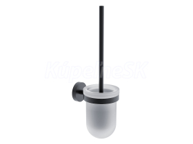 WC štětka. Nádobka nízká z matného skla. Rukojeť kartáče z mosazi s povrch. úpravou černá matná.