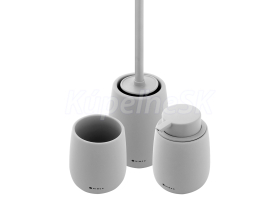 V sadě dávkovač tekutého mýdla, pohárek na kartáčky a WC kartáč. Nádobky keramické světle šedé matné. Objem dávkovače 425 ml. Pumpička plast. Rukojeť kartáče nerez ocel. "Soft touch" povrch.