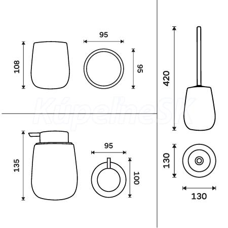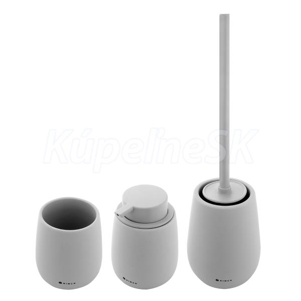 Sada doplňků do koupelny a WC obsahuje dávkovač tekutého mýdla, pohárek na zubní kartáčky a WC kartáč. Nádobky keramické světle šedé matné. "Soft-touch" povrch. Speciální dodatečná povrchová úprava. Povrch je hebký, příjemný na dotek.