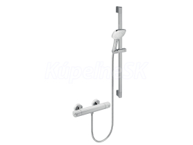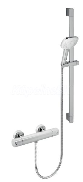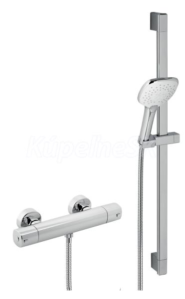 kategória distribúcie Novaservis: Vodovodní baterie | Sprchové baterie nástěnné. p. Sprchová nástenná batéria so spodným vývodom vody s rozstupom 150 mm, s termostatom na pravej rukoväti a reguláciou prietoku na ľavej rukoväti a sprchovou tyčí, která nabízí velký rozsah umístění montážních otvorů.. /p.