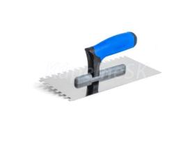 Zubová stierka z nehrdzavejúcej ocele 130 x 270 mm ergonomická, dvojzložková rukoväť z nehrdzavejúcej ocele, hrúbka plechu odolná voči kyselinám. 0,7 mm používa sa na nanášanie lepidiel pod dlaždice, veľkosť zubov je úmerná veľkosti dlaždíc
