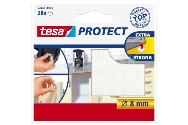 ochranné/protišmykové podložky tesa® Protect zníženie hluku pri zatváraní dverí alebo zásuviek zabraňuje skĺznutiu a pohybu predmetov chráni povrchy pred poškriabaním samolepiace Rozmery: približne 8 mm farba: transparentná materiál: etylén kopolymér obsah balenia výrobku: 28 ks