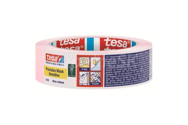 tesa® 4333 Precision Mask® Sensitive má veľmi jemný papierový nosič vyrobený z washi papiera a málo lepivého lepidla. vhodný na maskovanie veľmi citlivých povrchov v interiéri, napr. čerstvej farby, obkladov, maľovaných povrchov, tapiet atď. možno odstrániť do 14 dní bez zanechania zvyškov lepidla Technické vlastnosti: farba: ružová Celková hrúbka: 85 µm materiál nosiča: obyčajný papier typ lepidla: akrylové predĺženie pri pretrhnutí: 4,5 % pretrhávacia sila: 41 N/cm ručné odtrhnutie: veľmi dobré vhodné pre drsné povrchy: stredné Priľnavosť k oceli: 0,6 N/cm