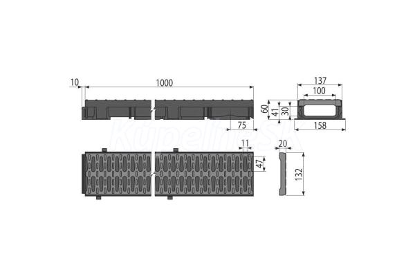 Vonkajší žľab Nízky, 1010 x 137 x 60 mm, plastový rám a rošt