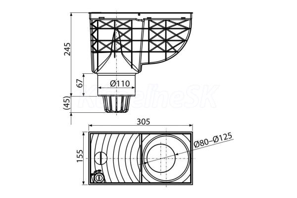 • Obsahuje tesniace krúžky na pripojenie dažďových zvodov rôznych priemerov (80, 90, 110, 125 mm), kryt žľabu (možno nahradiť mriežkou)