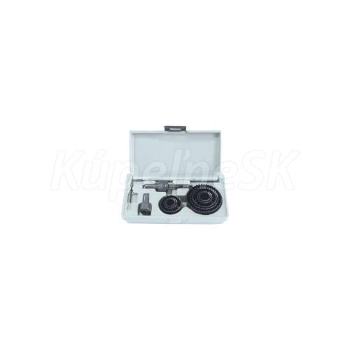 Sada súprav na vyrezávanie otvorov: O 19 mm, 22 mm, 28 mm, 32 mm, 38 mm, 44 mm, 51 mm, 64 mm, pilotný vrták 6 mm, adaptér - 2 ks, šesťhranný kľúč na vyrezávanie otvorov do dreva, sadrokartónu, preglejky atď. z vysokouhlíkovej ocele max.