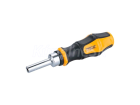 • Ráčnový skrutkovač s 1/4 držiakom bitov, CrV, ergonomická dvojzložková mäkká rukoväť, pákový otvor, magnetický hrot.