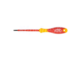 elektrický plochý skrutkovač VDE 1000 V, certifikát IEC/EN 60900 - 2004 kovová stopka z kvalitnej chróm-vanádiovej ocele tvrdený hrot je magnetický ergonomicky tvarovaná rukoväť (kombinácia polypropylénu a gumy) zaručuje vynikajúcu protišmykovosť