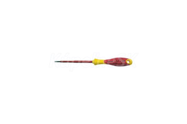 elektrický plochý skrutkovač VDE 1000 V, certifikát IEC/EN 60900 - 2004 kovová stopka z kvalitnej chróm-vanádiovej ocele tvrdený hrot je magnetický ergonomicky tvarovaná rukoväť (kombinácia polypropylénu a gumy) zaručuje vynikajúcu protišmykovosť