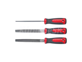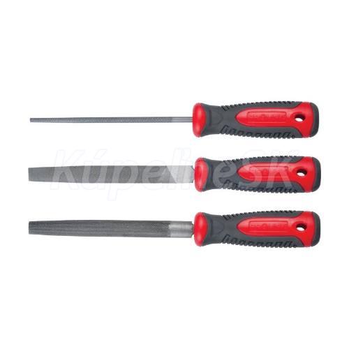 pilníky - sada 3 ks z kalenej ocele (60HRC) protišmyková rukoväť z TPR pilníky: plochý, polguľatý, trojuholníkový pracovná dĺžka: 200 mm drsnosť: 2