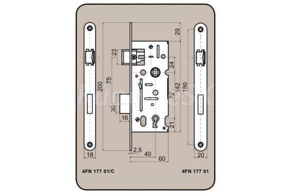 stavebný zámok V607 bežný zámok bez prevodovky určený pre jednoduché a dvojité dvere vpravo alebo vľavo rozstup: 72 mm Hĺbka zásypu: 60 mm šírka čelnej strany: 20 mm zadné osadenie: 40 mm povrchová úprava: biely zinok hmotnosť: 0,35 kg/ks nie sú určené pre požiarne/dymové dvere a únikové cesty