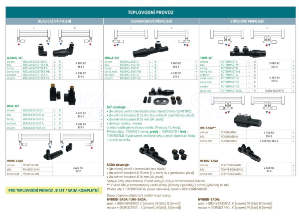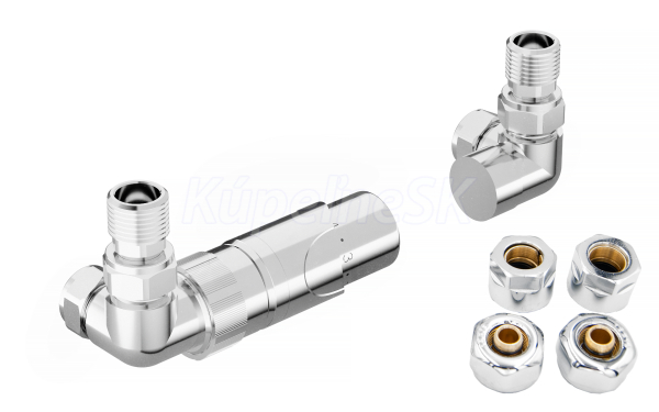 Univerzálna termostatická (pravý aj ľavý) súprava PRIME je určená na napojenie kúpeľňových radiátorov s rohovým vývodom ( tzv. na rozteč ). Ventil je určený pre pripojenie radiátorov na rozvody TÚV s vývodom zo steny . Súprava je vrátane zverného šróbenia Ø 15x1 (Cu) a Ø 16x2 (Alpex) . Prívod je vždy na strane termostatickej hlavice . Ventil dodávame v troch farebných variantoch (chróm, biela a čierna farba).