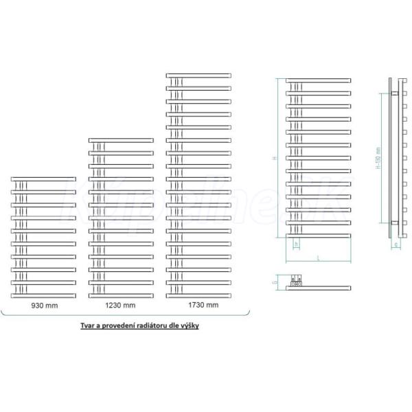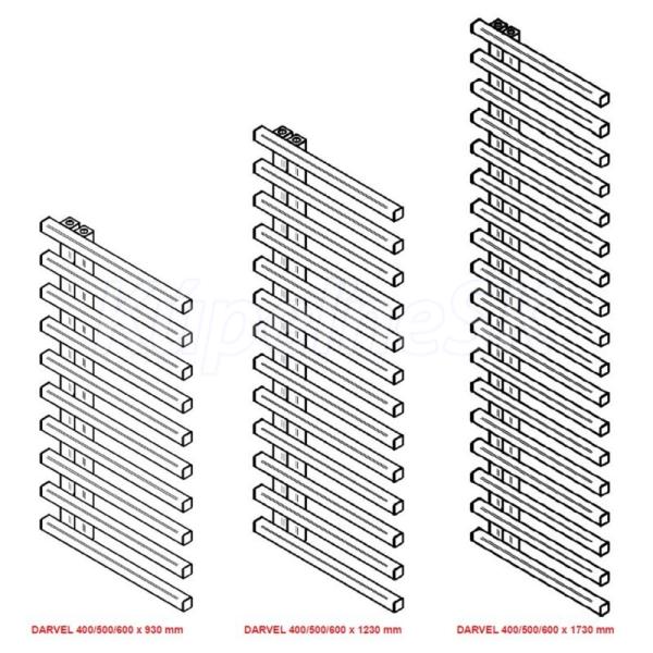 Kúpeľňové radiátory HOPA kompletne zmenia vaše predstavy o radiátoroch ako ich poznáte. Radiátory do kúpeľne sú opatrené dokonalou antikoróznou vrstvou. Až na antikoróznu úpravu je ešte len nanášaná prášková farba. Kúpeľňový radiátor je vhodný k jedno aj dvojrúrkovým vykurovacím systémom s čerpadlom. Alebo ako samostatné vyhrievacie teleso s elektrickou vykurovacou tyčou. Radiátory majú menší objem vody, veľmi rýchlo sa zahrievajú a sú výborne regulovateľné, takže si jednoducho nastavíte tú správnu teplotu pre váš dokonalý komfort. Radiátory sú dodávané vrátane ventilu HYBRID, BEZ vykurovacej tyče, za rozmerom je iba uvedený vhodný výkon tyče pre patričný rozmer. Dostupné rozmery a typy pripojenia radiátora DARVEL : 500 × 1230 mm, výkon 508 W, vykurovacia tyč 600 W 500 × 1730 mm, výkon 702 W, vykurovacia tyč 600 W 600 × 930 mm, výkon 450 W, vykurovacia tyč 400 W 600 × 1230 mm, výkon 578 W, vykurovacia tyč 600 W Typ pripojenia radiátora: Spodná D50 Kľúčové vlastnosti: rozmery horizontálnych profilov je 60x10 mm a vertikálnych profilov 30x30 mm elegantné háčiky HS3 slúžia na pohodlné zavesenie veľkých osušiek či županov pripojenie radiátora spodná D50 použitie elektrickej vykurovacej tyče vám umožní užívať si teplo po celý rok asymetrický dizajn uľahčuje sušenie uterákov a odevov unikátny tvar , ktorý bude ideálny pre všetky typy miestností jednoduchá inštalácia vďaka špeciálnym montážnym konzolám starostlivé zaistenie proti poškodeniu pri preprave nadštandardná záruka 15 l na radiátor ZÁRUKA 15 ROKOV NA RADIÁTOR, 2 ROKY NA VENTIL