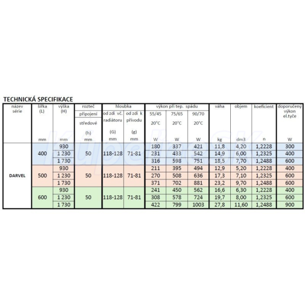 - 600 × 930 mm, výkon 450 W, vykurovacia tyč 400 W