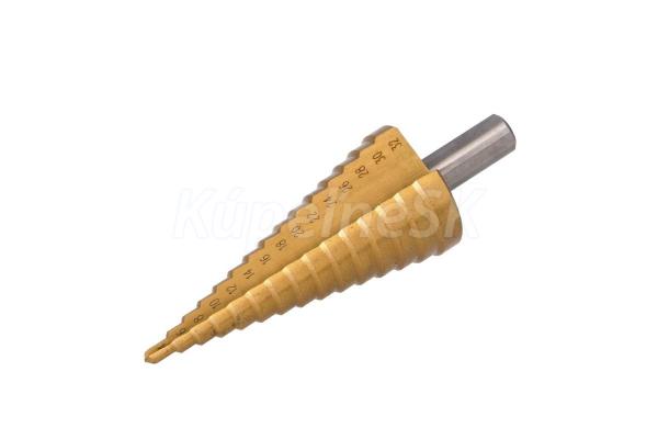 stupňovité vrtáky HSS z vysokolegovanej nástrojovej ocele M2 vďaka vysokému obsahu vanádu a volfrámu má veľmi vysokú odolnosť proti oderu a agresívne reže kalená oceľ 62 - 64 HRC určené na vŕtanie zliatin, ocele a nehrdzavejúcej ocele