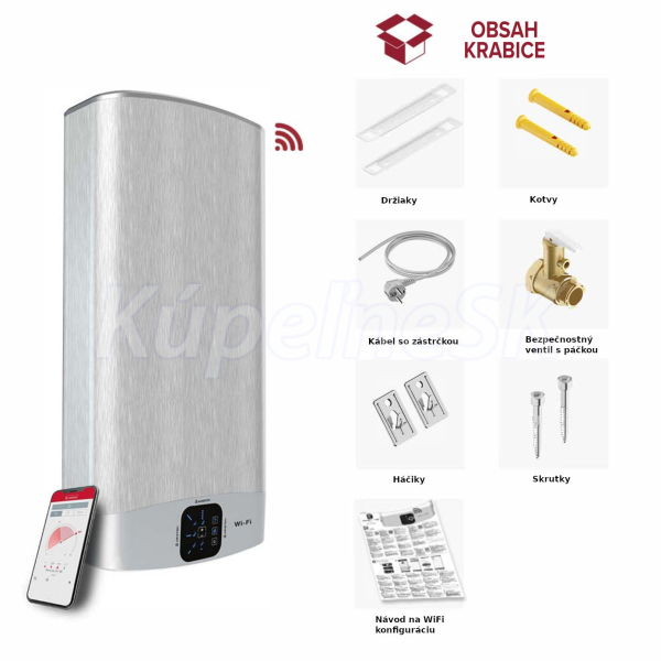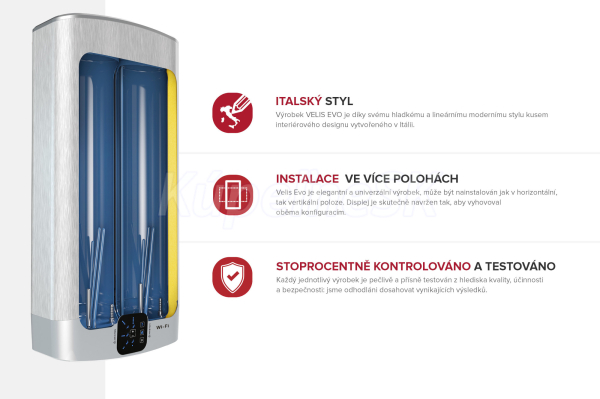 Ariston VELIS EVO WIFI 80 EU, kód 3626324, Ohrievače vody | Elektrické ohrievače vody | Ploché | 80 litrov Stredný elektrický ohrievač vody s objemom 80 l. Kompaktný, plochý na vertikálnu aj horizontálnu inštaláciu. Plánovanie a ovládanie ohrevu prostredníctvom WiFi.