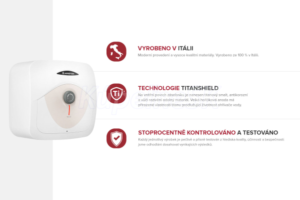 Ariston DUNE RS 15U 1,5K PL EU, kód 3100855, Ohrievače vody | Elektrické ohrievače vody | Tlakové | 15 litrov Bojler - objem 15 l, výkon 1500 W, pod kohútikom, medené vykurovacie teleso, rozmery 36 × 36 × 32,4 cm (V × Š × H), termostat, ochrana proti legionelám a ochrana proti zamrznutiu