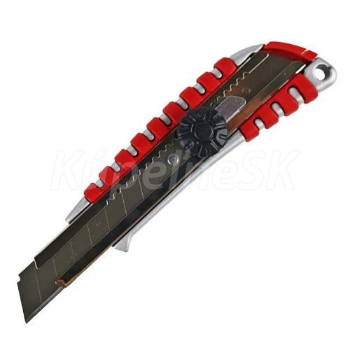 celokovové telo noža protišmyková rukoväť s plastovými výstupkami kovová vodiaca lišta skrutková aretácia šírka čepele 18 mm dva náhradné britvy v balení náhradné čepele kód: