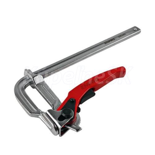 kovaná rýchloupínacia svorka ENPRO pákový rýchloupínací mechanizmus so zubovou poistkou pohyblivá čeľusť pre presné prispôsobenie tvaru zvieraného materiálu pre profesionálne stolárske, tesárske, zváračské práce