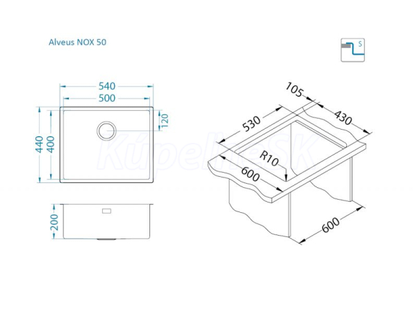Alveus NOX 50 F/S/U BRS 540x440 MATERIÁL: BRS ROZMERY: 540x440x200 Šírka skrinky Montáž F/S 600mm Šírka skrinky Montáž U 800mm MATERIÁL: BRS ROZMĚRY: 540x440x200 Šířka skříňky Montáž F/S 600mm Šířka skříňky Montáž U 800mm