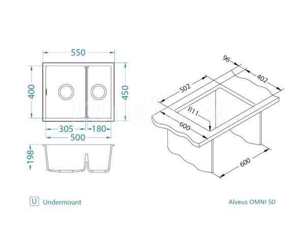 Alveus OMNI 50 G55 + jedn.sif. Vstavaný drez, univerzál. Prevedenie: granitový drez bez odkvapu Vonkajší rozmer: 550 x 400 mm Rozmer 2 vaničky: 305/180 x 400 x 198 mm Sitkový ventil 3 1/2, sifón pre úsporu miesta s odbočkou na umývačku Úchyty a tesnenia na upevnenie drezu v balení Návod na inštaláciu v obrázkoch na obale Inštalácia vrchná I montáž alebo spodná U, veľkosť skrinky 600 mm Rozmery balenia (mm): 575 x 680 x 270 mm Váha netto: 11,5 kg Vestavěný dřez, univerzál. Provedení : granitový dřez bez odkapu Vnější rozměr: 550 x 400 mm Rozměr 2 vaničky: 305/180 x 400 x 198 mm Sítkový ventil 3 1/2, sifon pro úsporu místa s odbočkou na myčku Úchyty a těsnění pro upevnění dřezu v balení Návod pro instalaci v obrázcích na obale Instalace vrchní I montáž nebo spodní U, velikost skříňky 600 mm Rozměry balení ( mm ): 575 x 680 x 270 mm Váha netto: 11,5 kg