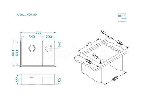 Alveus NOX 90 F/S/U BRS vstavaný nerez drez 582x440x200 mm,2 vaničky,Pravý,Kartáčov. Nerez