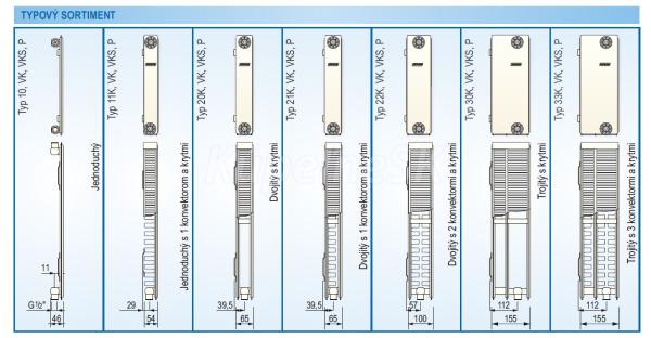 Radiátor typ Ventil-Kompakt (VK) je dodávaný so špeciálnou garnitúrou pre spodné pripojenie a ventilovou vložkou s prestaviteľnými hodnotami kv. Základný modelový rad radiátorov so 4-bodovým bočným pripojením a tvarovaným panelom s vertikálnymi kanálikmi. Súčasťou radiátora sú bočné kryty a vrchná mriežka. Od dĺžky 1700mm majú radiátory navarené 3 dvojice závesných držiakov. Povrchová úprava výrobkov KORAD pozostáva z troch základných krokov: 1.chemická predúprava - odmastenie, fosfátovanie. 2. 10 - 18 µm kataforeticky nanesená základná farba vypaľovaná v peci pri teplote 140°C po dobu 40 minút , 3. 60 - 80 µm elektrostaticky nanesená prášková farba vypaľovaná v peci pri teplote 180°C po dobu 20 minút.Panel radiátora je zvarený z dvoch výliskov, po obvode švovým zvarom. Panelové radiátory KORAD sú učené do vykurovaných priestorov s nízkou relatívnou vlhkosťou (30 - 60%) byty, kancelárie, školy, hotely, obchody, múzeá a pod. Panelové radiátory je najvhodnejšie situovať min. 140 mm pod okenný parapet do zvislej osi okna vo výške min. 70 mm od podlahy. Montáž radiátorov doporučujeme vykonávaťť v zabalenom stave, čím sa zabezpeeí maximálna ochrana radiátorov až do ukončenia všetkých stavebných prác. Na čistenie radiátora je možné použiť čistiace prostriedky určené na čistenie lakovaných povrchov. Nepoužívajte abrazívne čistiace prostriedky ani prostriedky obsahujúce chlór a kyseliny. ZÁRUKA 10 rokov.