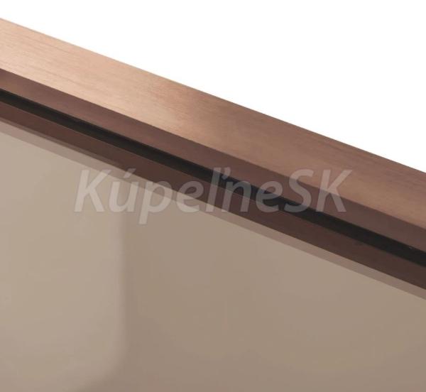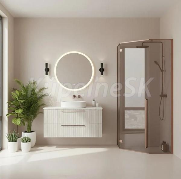 Profilové lišty, pánty a úchyty sú upravené v farbe brúseného brómu, čo vytvára harmonický kontrast so sklom a pridáva kabíne modernú eleganciu. Dvere sa otvárajú na pevných pántoch, ktoré zaručujú stabilitu, a ergonomická rúčka zabezpečuje pohodlie pri každodennom používaní.