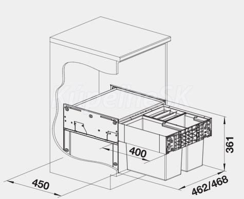 Výška zabudovania 361 mm, hĺbka zabudovania 400 mm, nutný vnútorný rozmer pre pojazdy 450 mm.