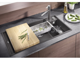 Blanco vstavaný drez AXIA III 6 S SILGRANIT InFino s excentrom sivá vulkán SILGRANIT® Jedinečne ergonomický plynulá, ergonomická práca pozdĺž celého drezu dizajn vyznačujúci sa čistými líniami a obzvlášť úzkym, plochým okrajom úzke rádiusy pre maximálne využitie priestoru a objemu vaničky posuvná sklenená doska na krájanie multifunkčná miska, ktorú možno variabilne umiestniť a zavesiť do hlavnej vaničky vybavený bočným prepadom C-overflow® a výpusťou InFino® - elegantne integrovaná a mimoriadne jednoduchá na údržbu k dispozícii tiež varianta pre zabudovanie do roviny s pracovnou doskou V balení tohto drezu sa nachádza: Kompozitná doska na krájanie z jaseňa, multifunkčná nerezová miska, odtoková armatúra, dve 3 1" InFino® výpuste so sitkami, excent. ovládanie pre hlavnú vaničku, zápachový uzáver s odbočkou pre umývačku riadu