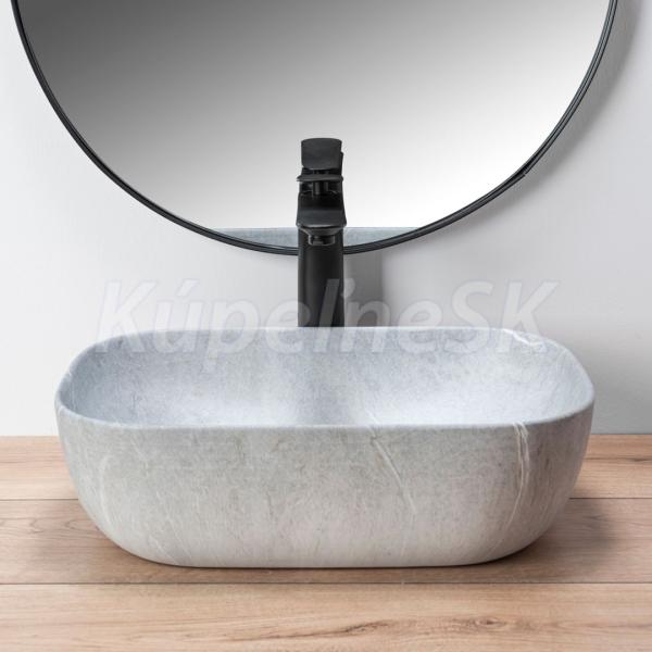 Krásna umývadlo napodobujúce kameň – Livia Grey. Vďaka technike, akou bola vyhotovená vrchná vrstva umývadla, každý kus má jedinečný a originálny vzor. Tento efekt napodobňuje prírodný kameň. Umývadlo je určené na montáž na dosku alebo skrinku. Vyrobené je z vysoko kvalitnej sanitárnej keramiky. Vďaka špeciálnej fáze výroby je odolné a ľahko sa udržiava v čistote.