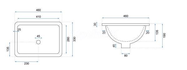 Keramická umývadlo, vhodná na montáž pod dosku. Súčasťou balenia je kovová montážna súprava, vďaka čomu je inštalácia umývadla jednoduchá a rýchla. Na vyrezanie nie je potrebný šablón, stačí umývadlo obrátiť a odry.