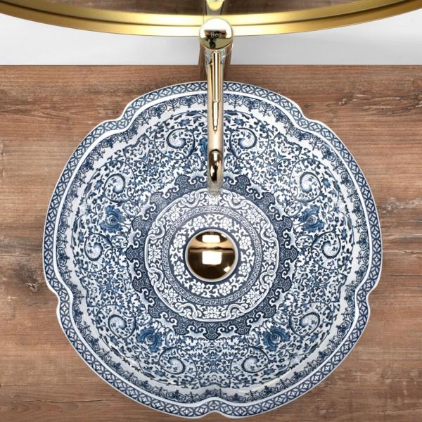 Umyvadlo vyrobené z najvyššej kvality keramiky v bielej farbe a okrúhlom tvare. Povrch s vysokým leskom spolu s modrým vzorom pridáva na elegancii, ozdobujúc pritom interiér. Bude sa hodiť ako praktické riešenie, celok je veľmi ľahko udržiavateľný.