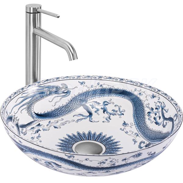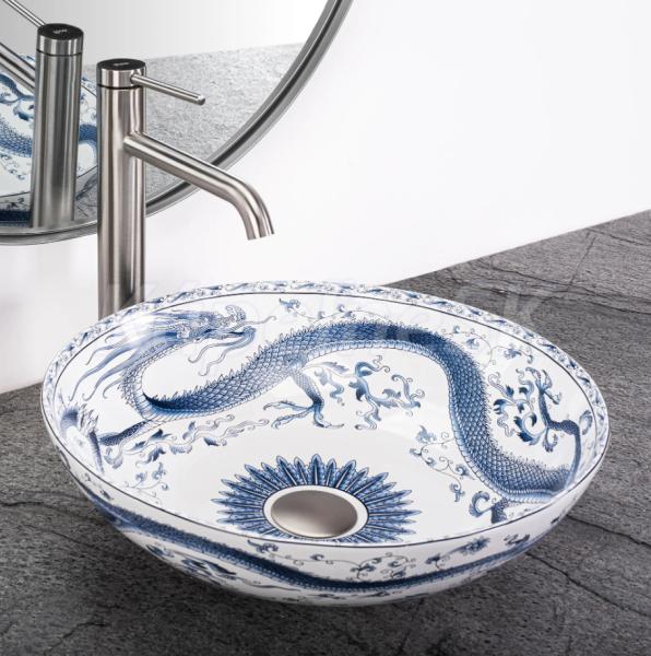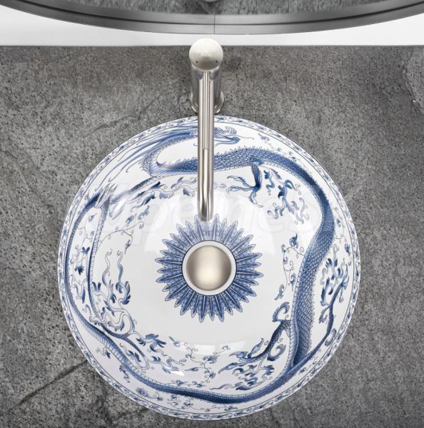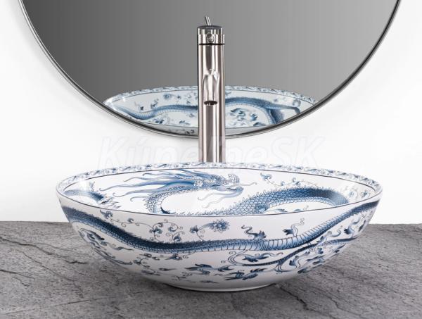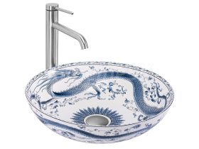 REA Kioto keramické okrúhle umývadlo na dosku priemer 40 cm Biele/Modrý vzor lesklé U6032