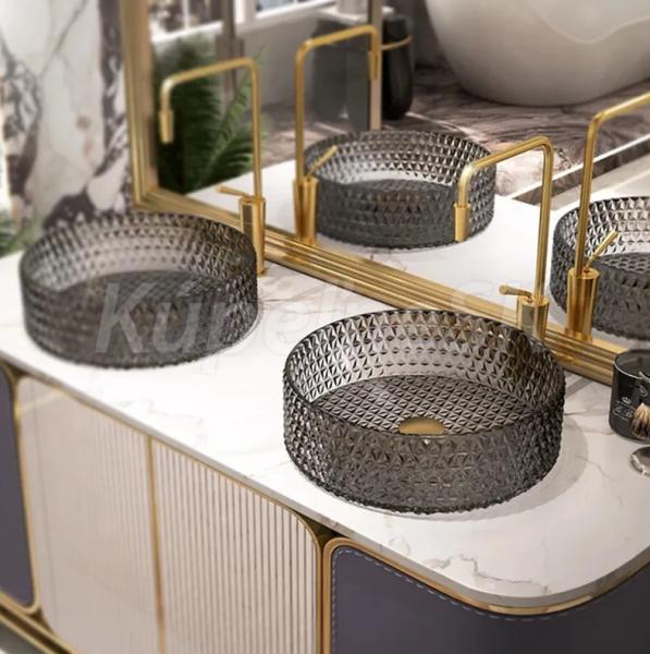 Moderná krištáľová umývadlo zo série Cristal bude úžasne vynikať vo vašej štýlovej kúpeľni. Bola vyrobená z vysoko kvalitného skla, prispôsobená na montáž na dosku alebo na skriňu. Zaujímavý vizuálny efekt zvýrazní odrážajúci sa v kryštáli