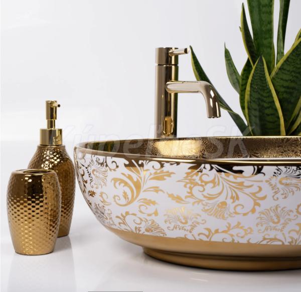 Je to produkt, ktorý vynikajúco doplní váš priestor v kúpeľni, zachovávajúc bezchybny vzhľad a estetiku interiéru. Misa je pokrytá krásnou zlatou farbou s rastlinným motívom, ktorá kontrastuje s bielou farbou.