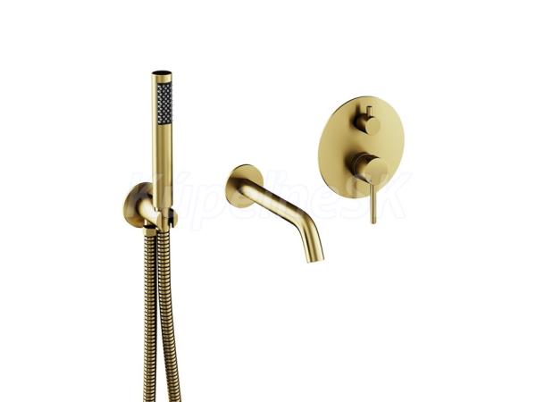 Jedinečný 3-otvorový podomietkový set s príslušenstvom VEO zlatá brúsená farba . Kompletné riešenie pre vašu vaňu. Set obsahuje podomietkovú batériu, vývod zo steny s držiakom, ručnú sprchu a hadicu . Batéria je dodávaná vrátane podomietkového modulu , ten výrazne uľahčuje montáž. Dodávame v šiestich farbách chróm, čierna, grafitová, zlatá, zlatá brúsená a zlatá lesklá.