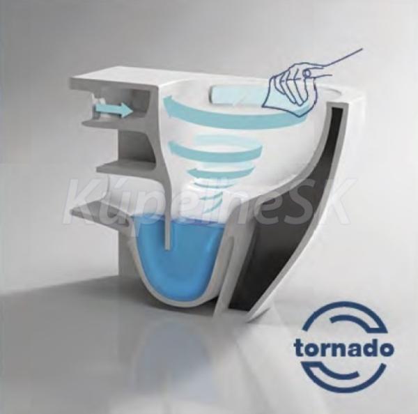 Patentovaný systém Tornado s tryskou čistí celý vnútorný priestor s doposiaľ nevídanou dôkladnosťou . Voda pod tlakom z trysky preniká vírivým pohybom do každého záhybu misy . Tento systém splachovania je nielen podstatne účinnejší ako bežné spádové splachovanie, ale aj tichšie a úspornejšie . Tradičné WC záchody majú pod okrajom veľmi ťažko prístupné miesta, v ktorých sa zhromažďujú nečistoty a baktérie. S inovatívnou technológiou TORNADO bol tento problém vyriešený – zo záchodovej misy bol odstránený vnútorný „golier“ a teda aj ťažko prístupné miesta. Teraz pri splachovaní voda oplachuje všetky vnútorné plochy misy a ľahko sa tiež dostane ku všetkým vnútorným plochám, misa je tak vždy dokonale čistá.